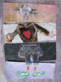 75 participants from a spectrum of ethnicities, age groups, abilities, and walks of life, attended a series of small group gatherings at local venues in their own community. Referencing the 'Exquisite Corpse' (a 19th century parlour game) each participant was invited to create one of four separate segments of the human body - 1) the head and shoulders; or 2) the arms and waist; or 3) the hips to the knees; or 4) the lower legs and feet. These sections were combined to create 'exquisite beings' that were attached to netting within a suspended frame. Photos and video footage taken during the creative sessions captured moments of fellowship, laughter, deep concentration, contemplation, personal breakthroughs and creative interactions. The photographic footage was screened alongside the artwork and was also used in a short film made after the exhibition.